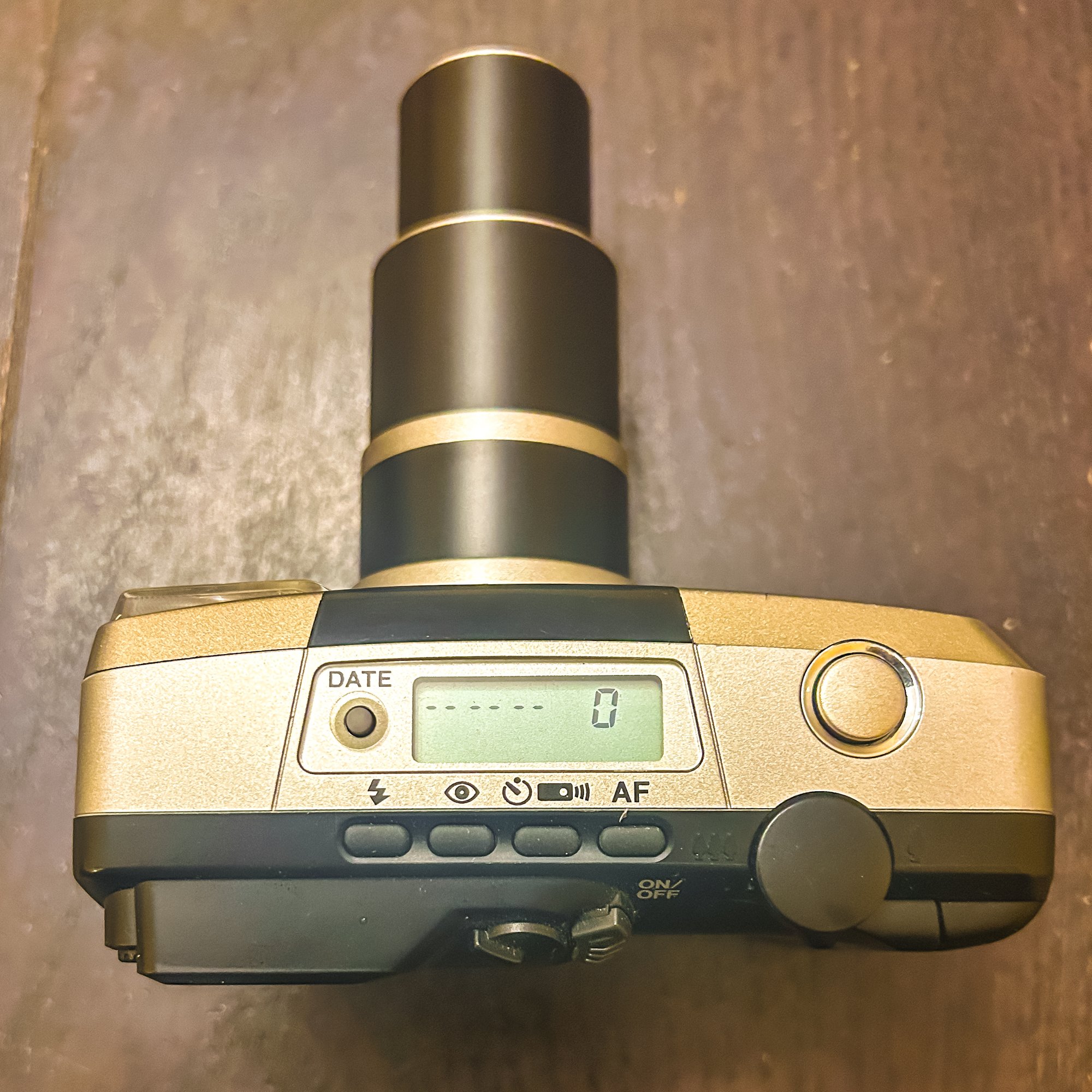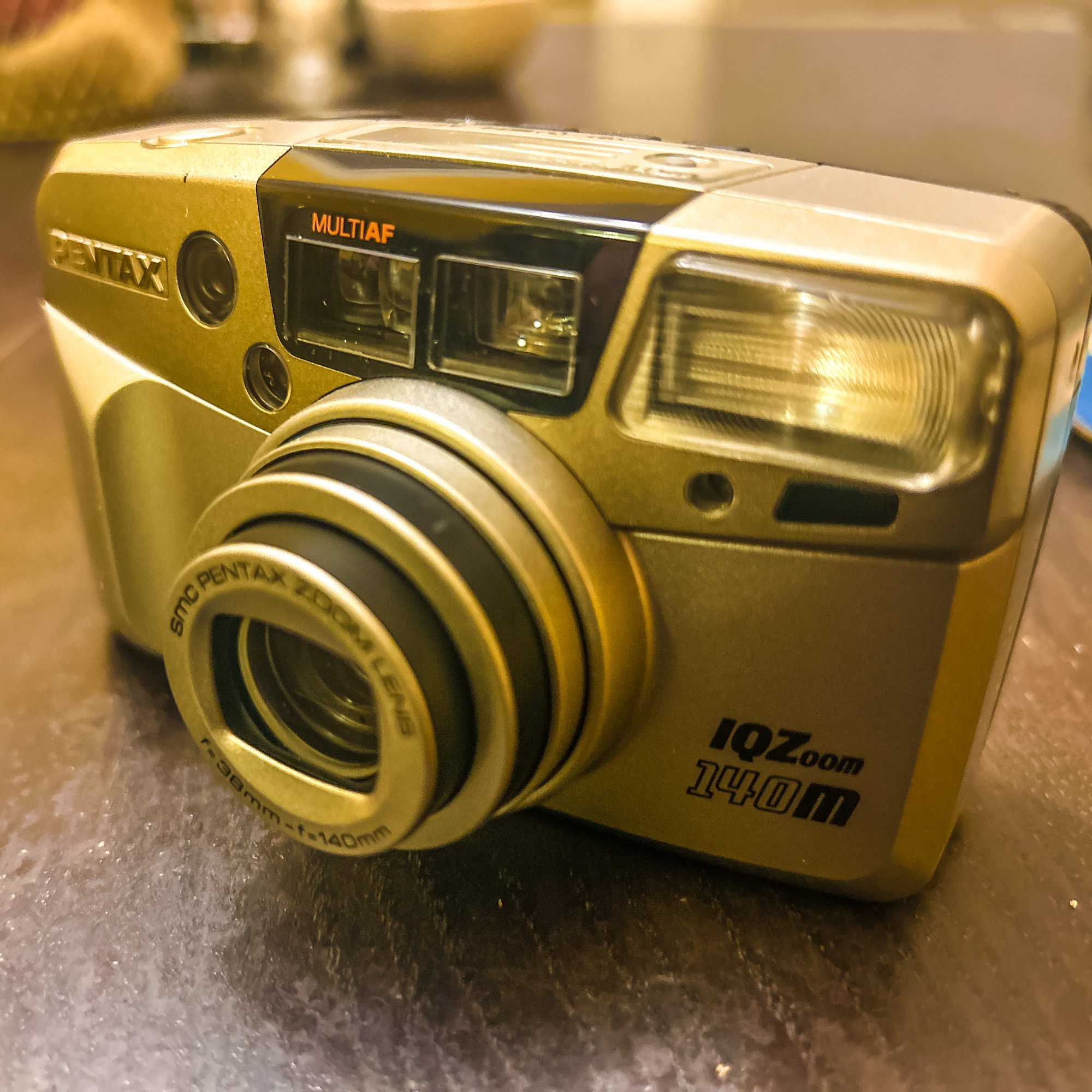 The Pentax IQZoom 140M, also known as the Espio 140M outside of North America, is a chonky circa 1995 electronic "compact" point-and-shoot 35mm camera. It features a lens that zooms from 38 mm (widish) to 140mm (super tele). Autoexposure and autofocus with auto flash, plus a few nice extra features such as landscape focus and self timer. It's a fairly advanced point and shoot for its time that will give you good results.